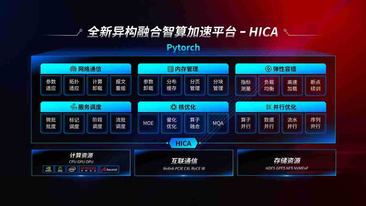 通过自研的服务层、、、中间适配层、、、、以及调度编排算法,,采用数据并行、、、、模型并行等多种并行方式,,把并行计算任务进行有效的分解,,,使其分别由相应的软件栈和算力资源来承接。。当GPU资源变化,,,,HICA可以实时动态调度计算子任务并调整模型拓扑和架构,,,,以充分聚合各种算力资源。。