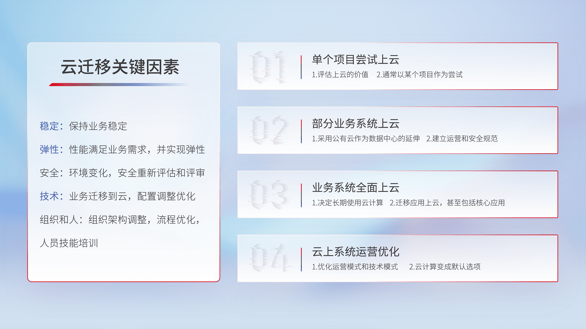 结合实际业务,,,,从规划设计、、、云平台选型、、云原生改造、、、数据迁移、、、集成交付,,,,迁移全过程为客户识别最佳上云路径,,,,做好风险识别管理,,,设计网络架构、、、、身份权限、、安全审计合规、、、、操作审计、、、、日志审计、、、监控告警策略、、多站点容灾设计等,,,,对云上基础设施进行整体规划,,,,提升IT治理水平,,以满足弹性、、、高可用、、、高性能的需求。。
