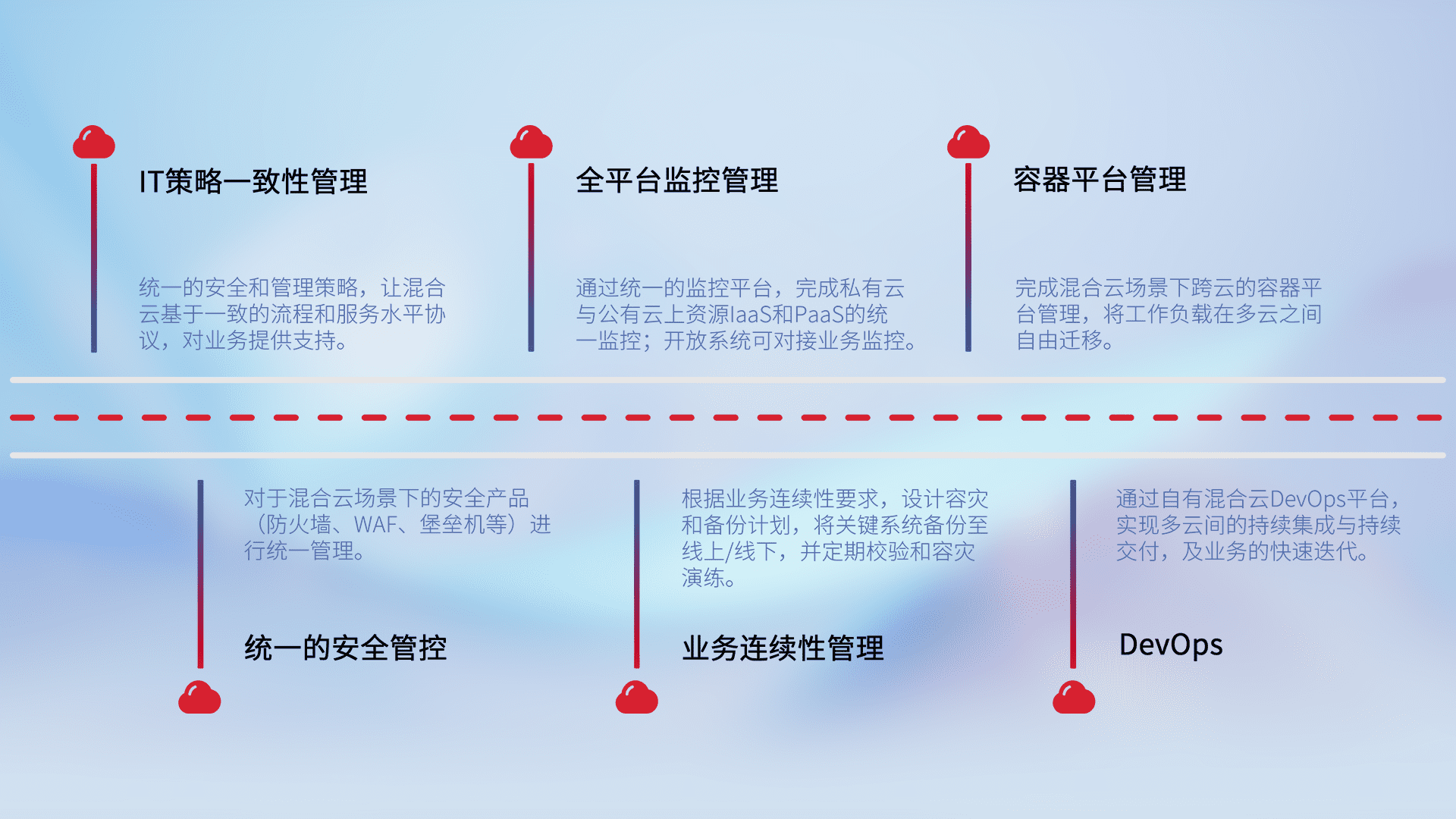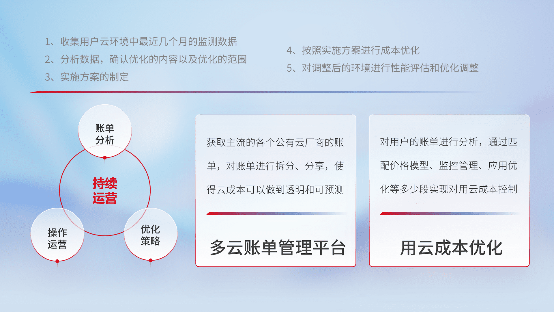 通过多云纳管,,,以统一的资源数据模型把客户的云资源进行抽象和封装,,,进而实现对多云资源的统一操作,,保障云资源管理的可靠性、、稳定性与可用性。。量身定制化运维内容,,,配置、、、开发运维、、、补丁管理、、、、备份、、监控、、、、认证和访问管理、、审计和日常巡检等,,,,保障在用云过程中的可靠度,,,,稳定度以及高可用率。。。
