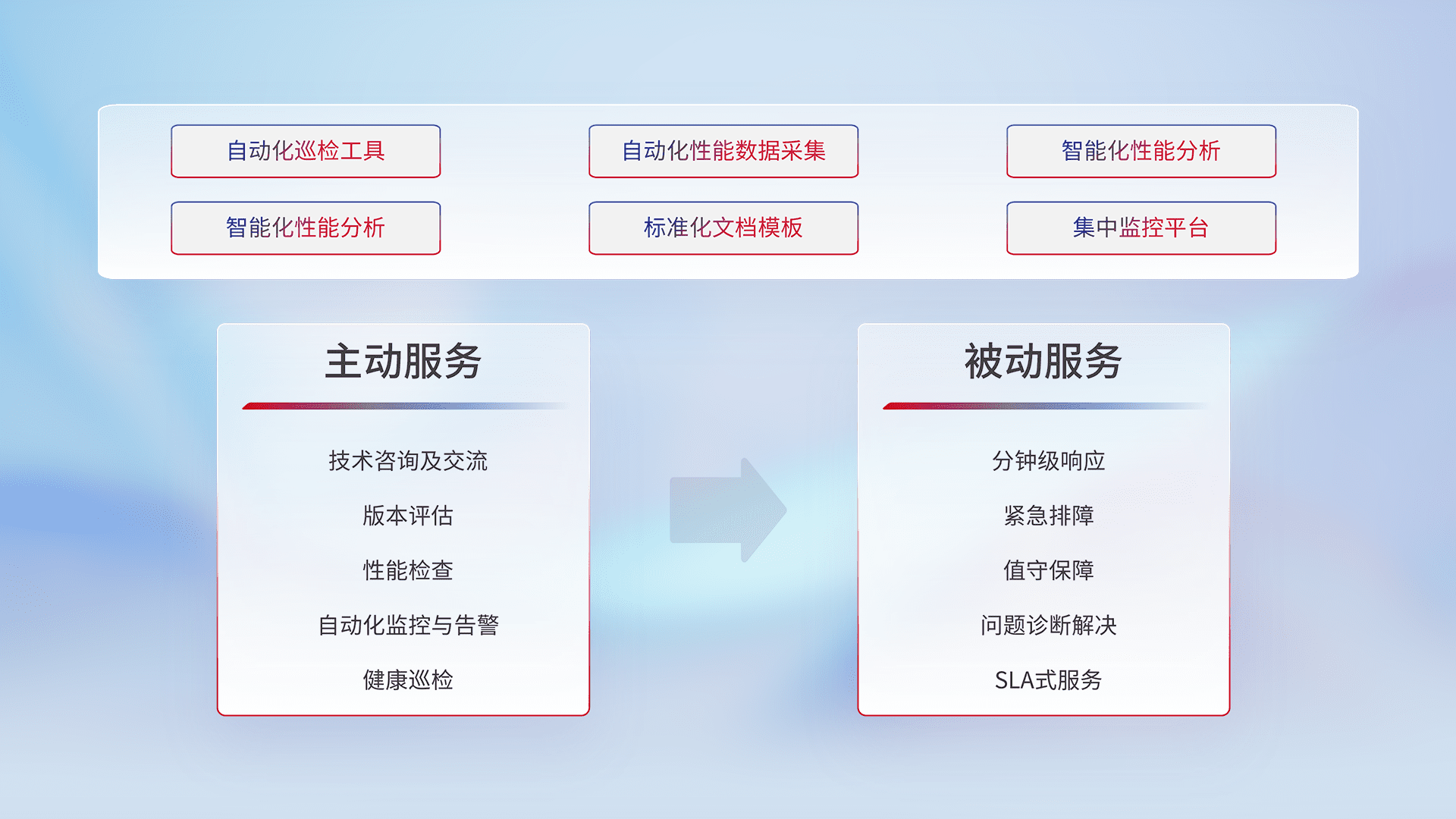 智能化工具和标准化文档,,,,保障服务质量,,提供主动服务(包含技术咨询、、版本评估、、、性能检查、、自动化监控与告警、、、健康巡检)和被动服务包含(分钟级响应、、、紧急排障、、、、值守保障、、、问题诊断解决、、、、SLA服务)。。。。